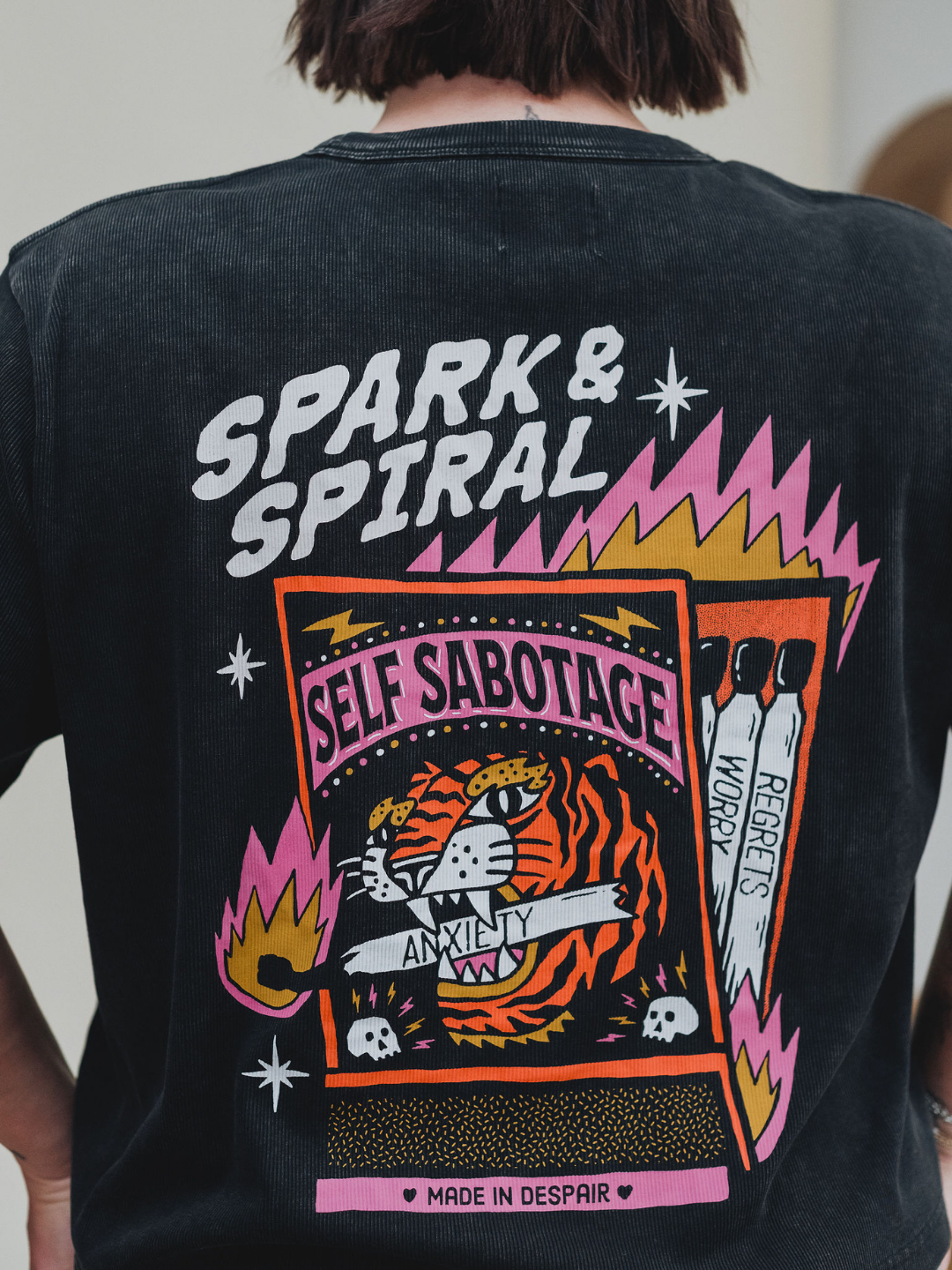 Spark & Spiral captures the all too familiar cycle of lighting your own worries on fire and watching them spiral. The tiger is that unhinged voice that bites down on every anxious thought, and the matchbox holds the usual suspects: anxiety, worry, regrets. It’s bold, a little chaotic, and painfully hones, the perfect tribute to self sabotage in all its messy glory.