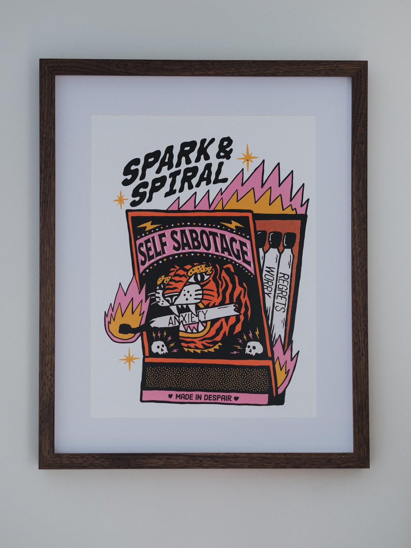 Spark & Spiral captures the all too familiar cycle of lighting your own worries on fire and watching them spiral. The tiger is that unhinged voice that bites down on every anxious thought, and the matchbox holds the usual suspects: anxiety, worry, regrets. It’s bold, a little chaotic, and painfully hones, the perfect tribute to self sabotage in all its messy glory.